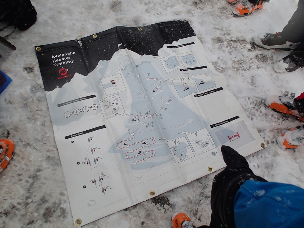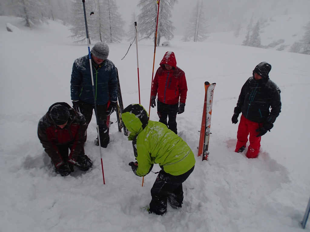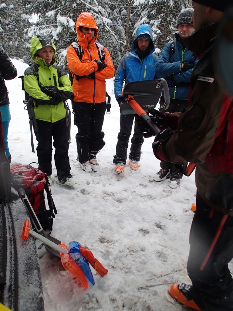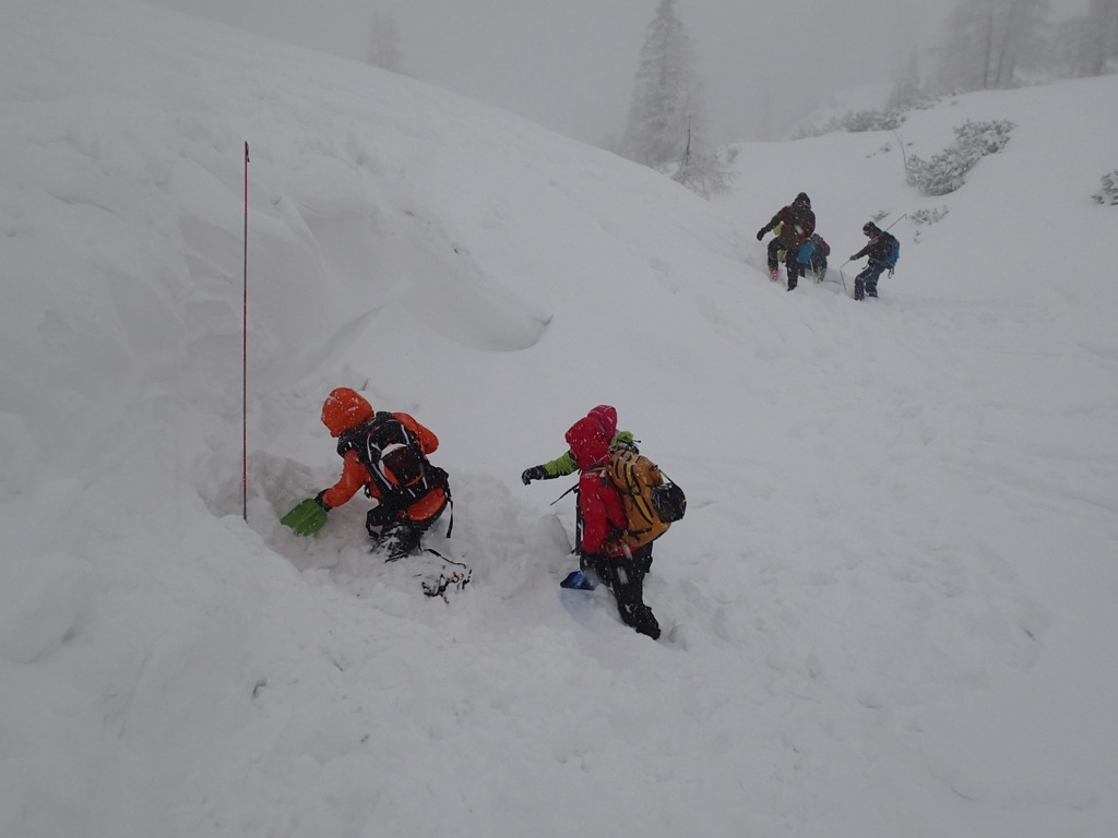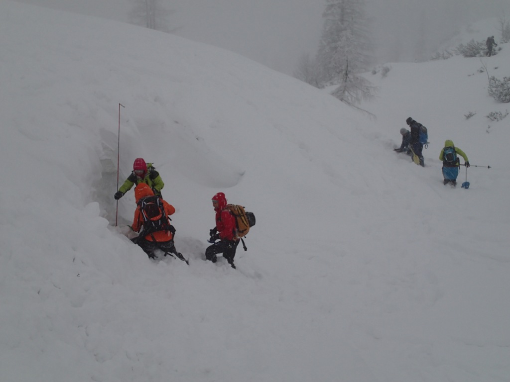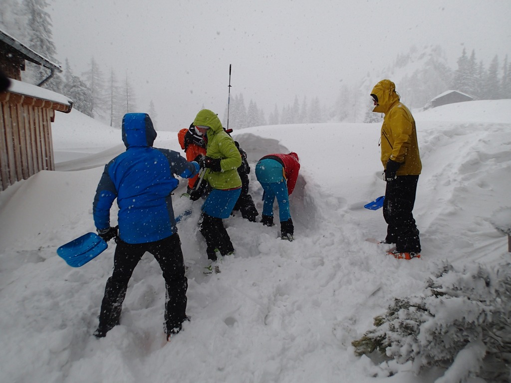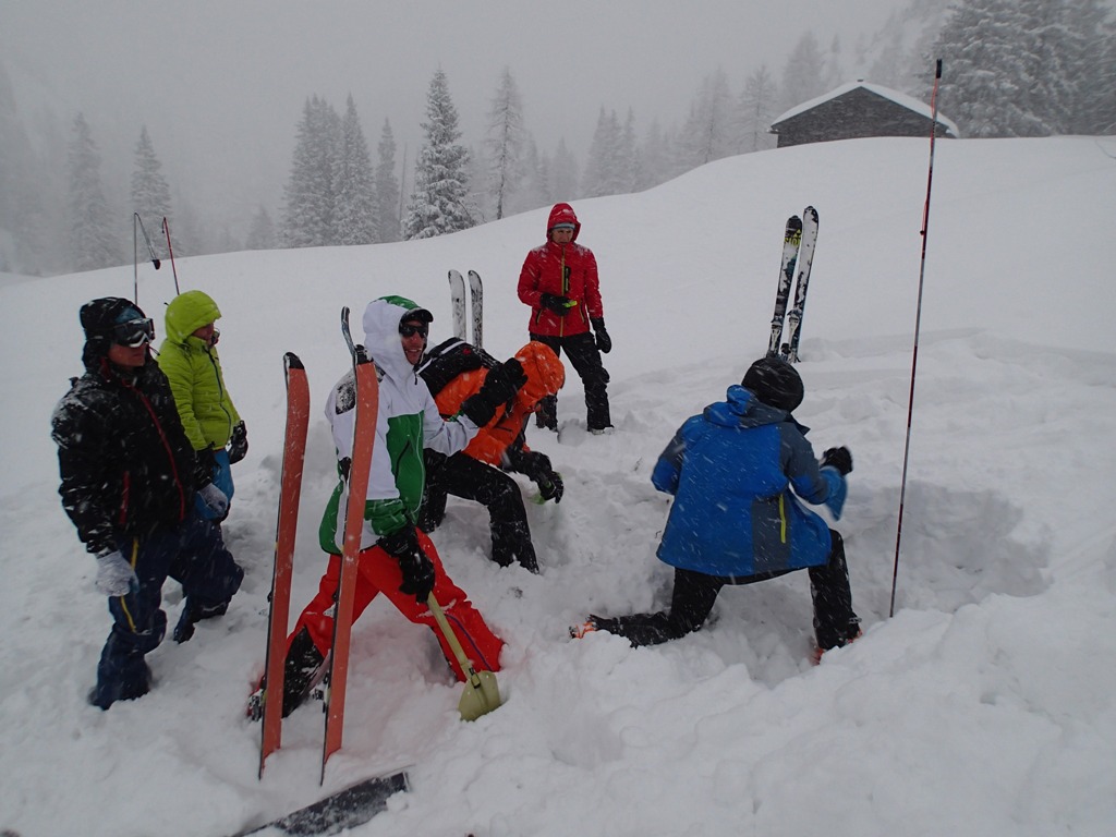 Bei der Einzellverschüttung wurde die Oberflächen/Signalsuche, Grob- und Feinsuche sowie das richtige Sondieren (Punktortung) geübt. Danach kamen die Schaufeln zum Einsatz. Beim Effizienten Schaufeln (V-förmigen Schneeförderband) wurde jeder wieder warm.