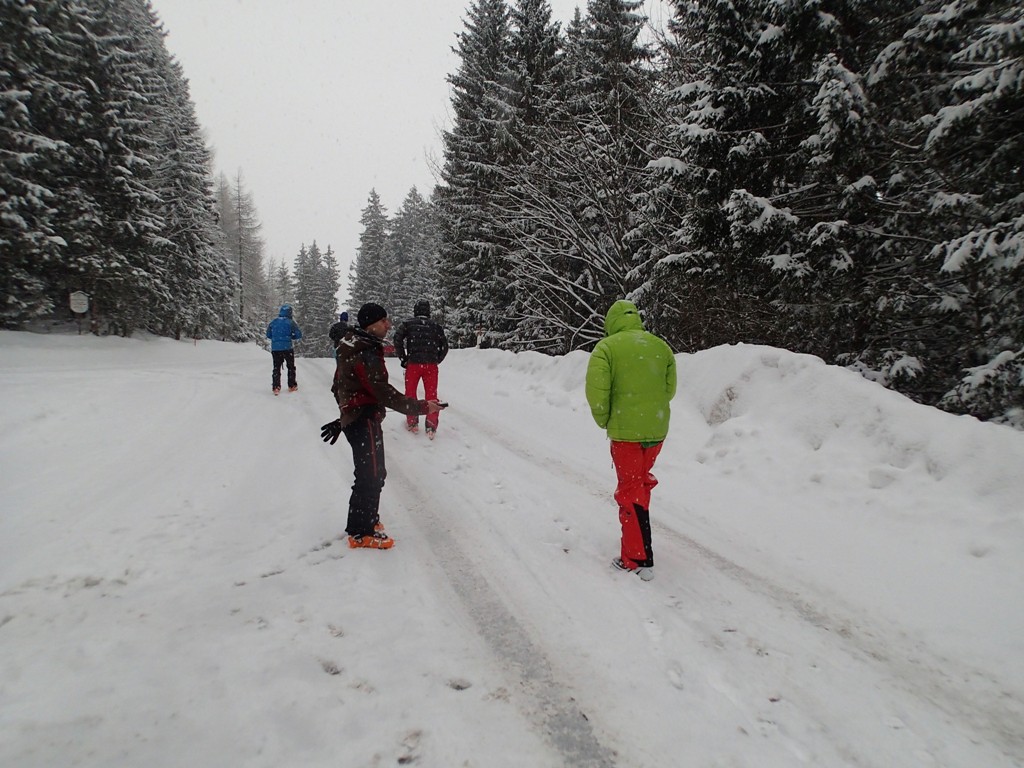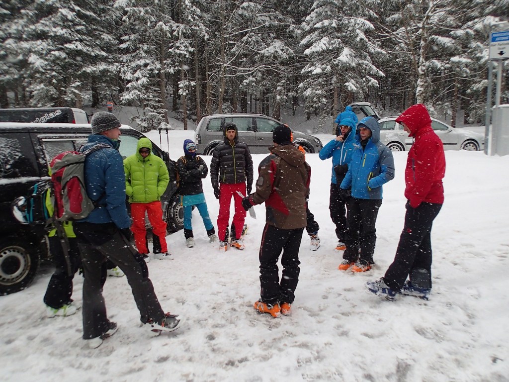 An der jährlich stattfindenden LVS Übung nahmen am 25. Jänner 13 Teilnehmer teil. Bei winterlichen -1°C und Schneefall trafen wir uns bei der Jenner Mittelstation in Hinterbrand (Berchtesgaden). Der am Vortag einsetzende ergiebige Schneefall wurde von allen schon sehnsüchtig erwartet. Bevor es mit den Skiern Richtung Schneibsteinhaus los ging gab es noch eine Auffrischung zum Thema: