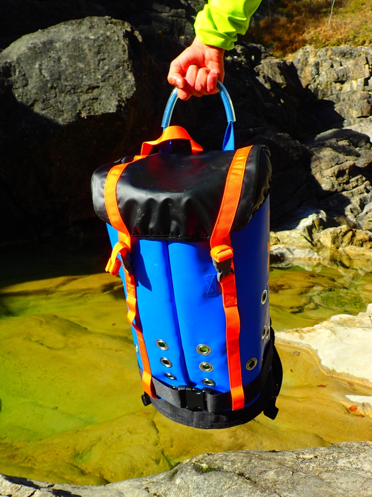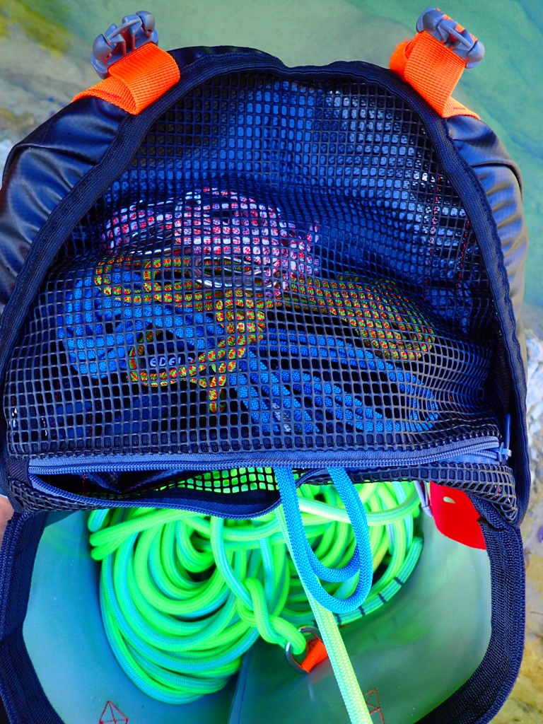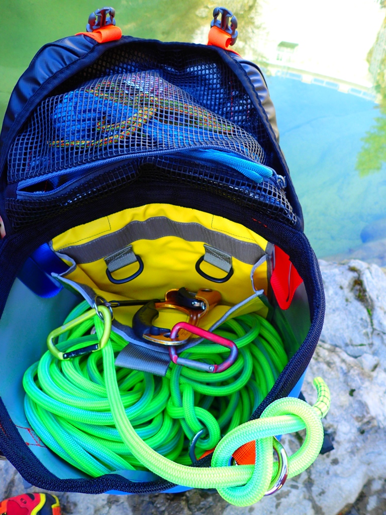 Der Rucksack hat eine optimale Größe. So bietet er wenig Angriffsfläche bei aquatischen Touren, hat genug Platz für eine 6,4l Wasserdichte Tonne, ein 70m Seil und einer Notfallausrüstung (wie z.B. Steigklemmen, Mini Traxion und Bandschlingen).