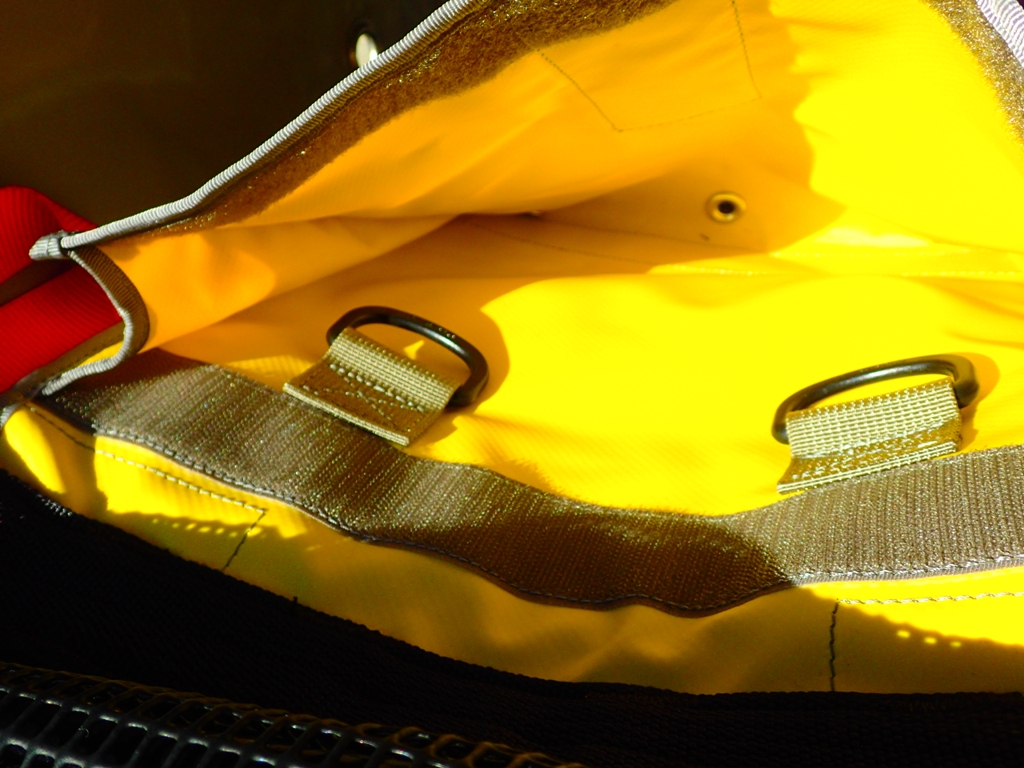 Für schwerere Materiale wie z.B. Steigklemmen, Rollen, Karabiner, etc. gibt es eine weitere Materialtasche aus gelbem Planenstoff, die mit einem Klettverschluss verschlossen wird. Im inneren der Tasche befinden sich 2 Kunststoff D-Ringe zum verhängungsfreien Anbringung der Materialien. Sowie 3 kleine Ösen für den Wasserablauf.