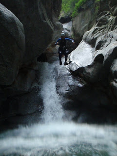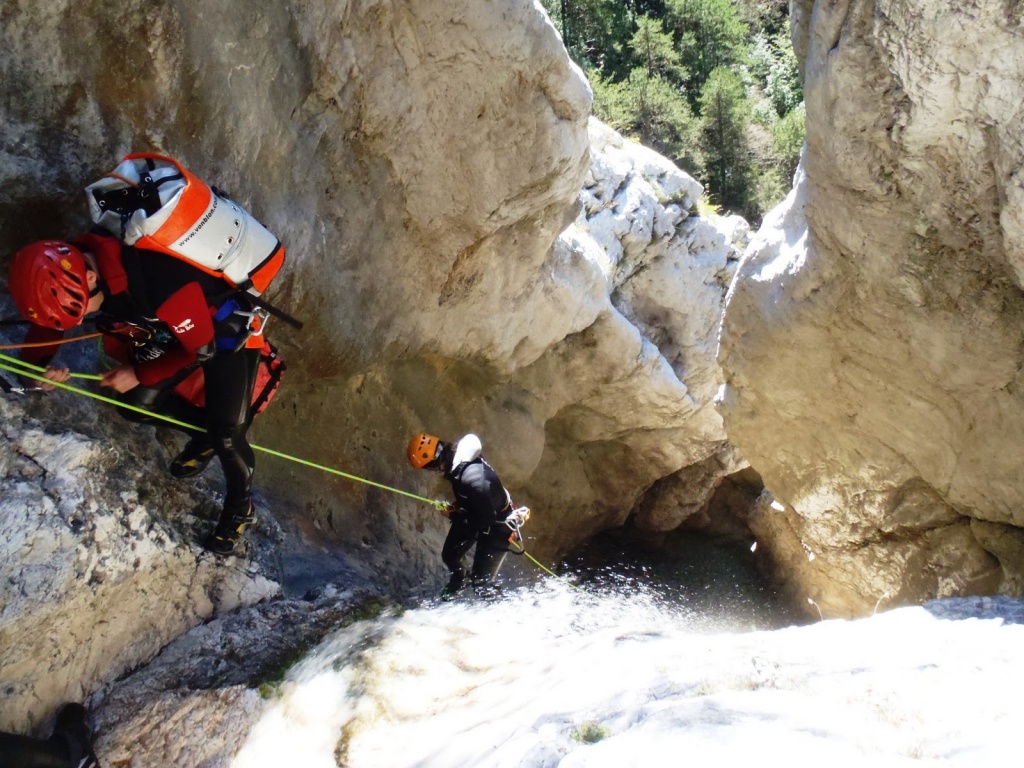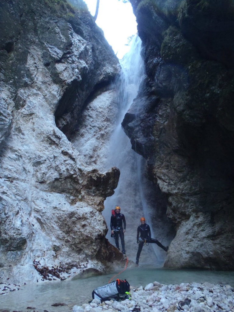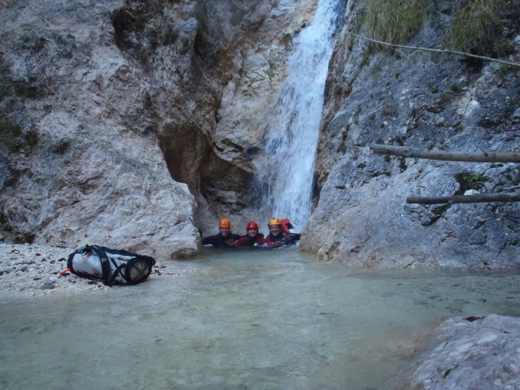 Diese Schlucht kannten wir noch nicht. So konnten wir als Abschlusstour auch noch einen neuen Canyon gehen. Über einen recht steilen Grashang stiegen wir in die Schlucht und waren von den schönen Abseilpassagen während der Tour begeistert. Kurze Rutschen und kleine Sprünge wurden absolviert. Die Wassertemperaturen waren dank schützender Skiunterwäsche recht erträglich.