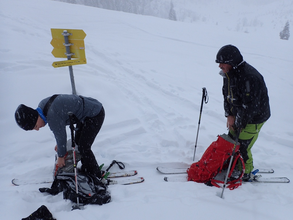 Ausrüstung: Skitourenausrüstung + Notfallausrüstung (LVS-Gerät, Schaufel, Sonde) + evtl. Tee und Geld für Hütte mitnehmen.