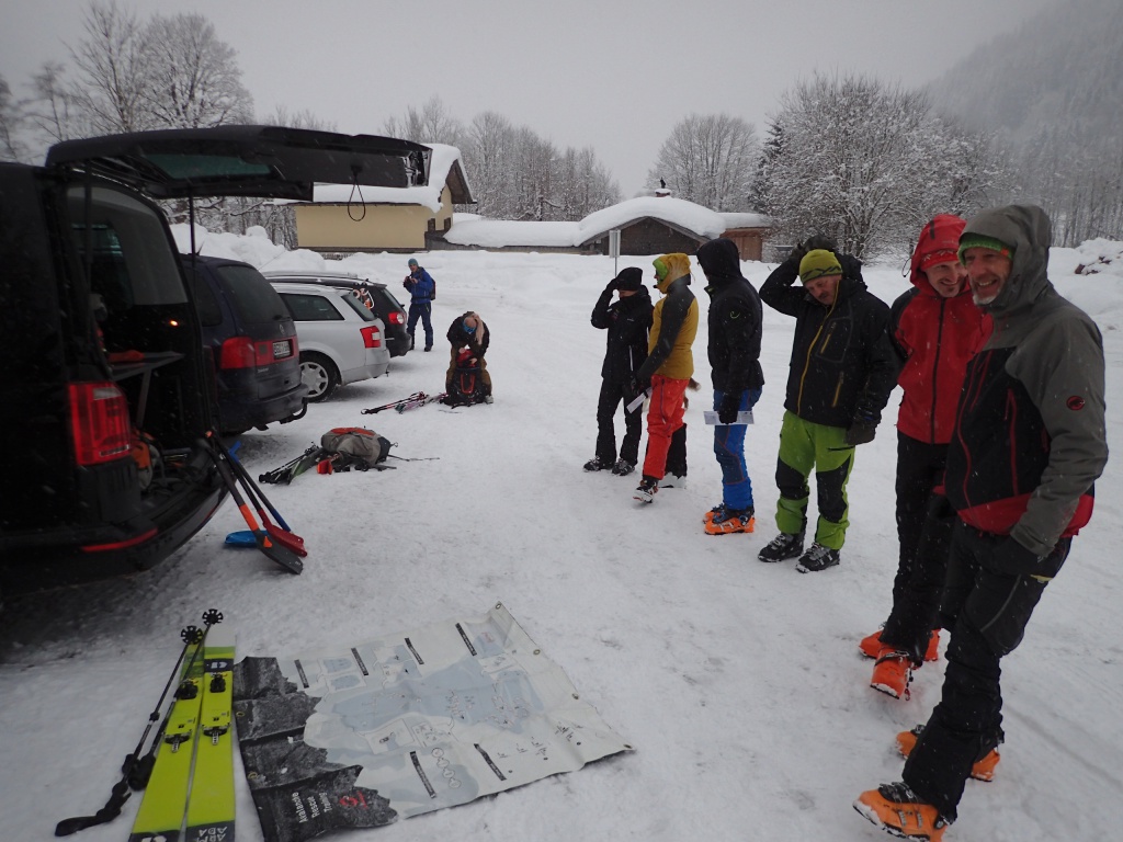Noch am Parkplatz wurde der Lawinenlagenbericht/Wetterbericht, die Standards für die Planung und