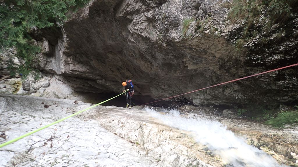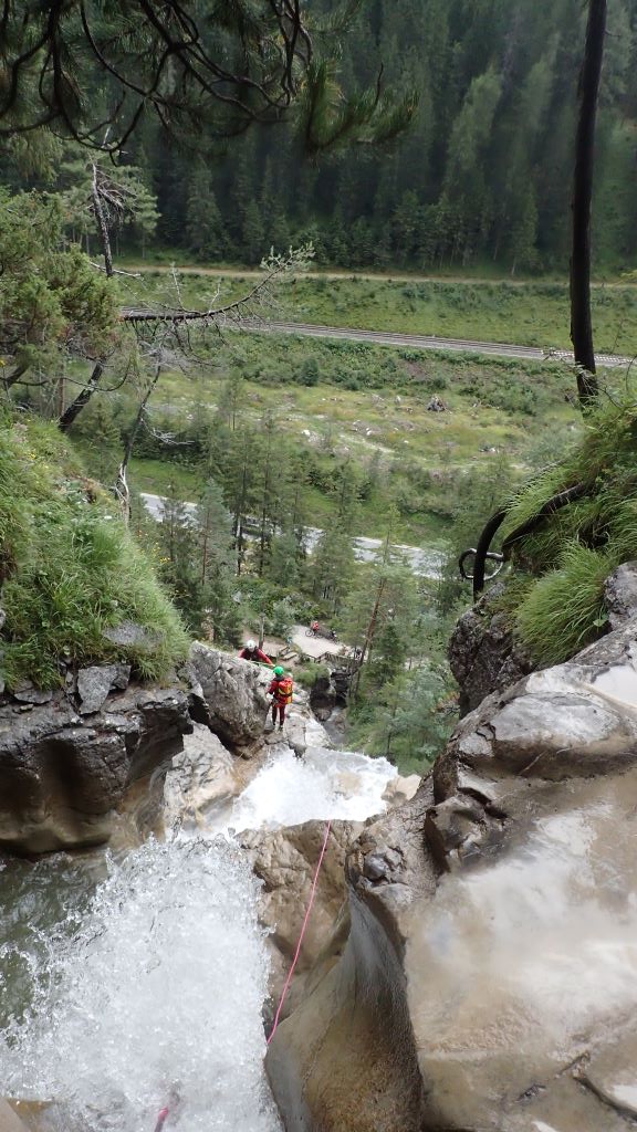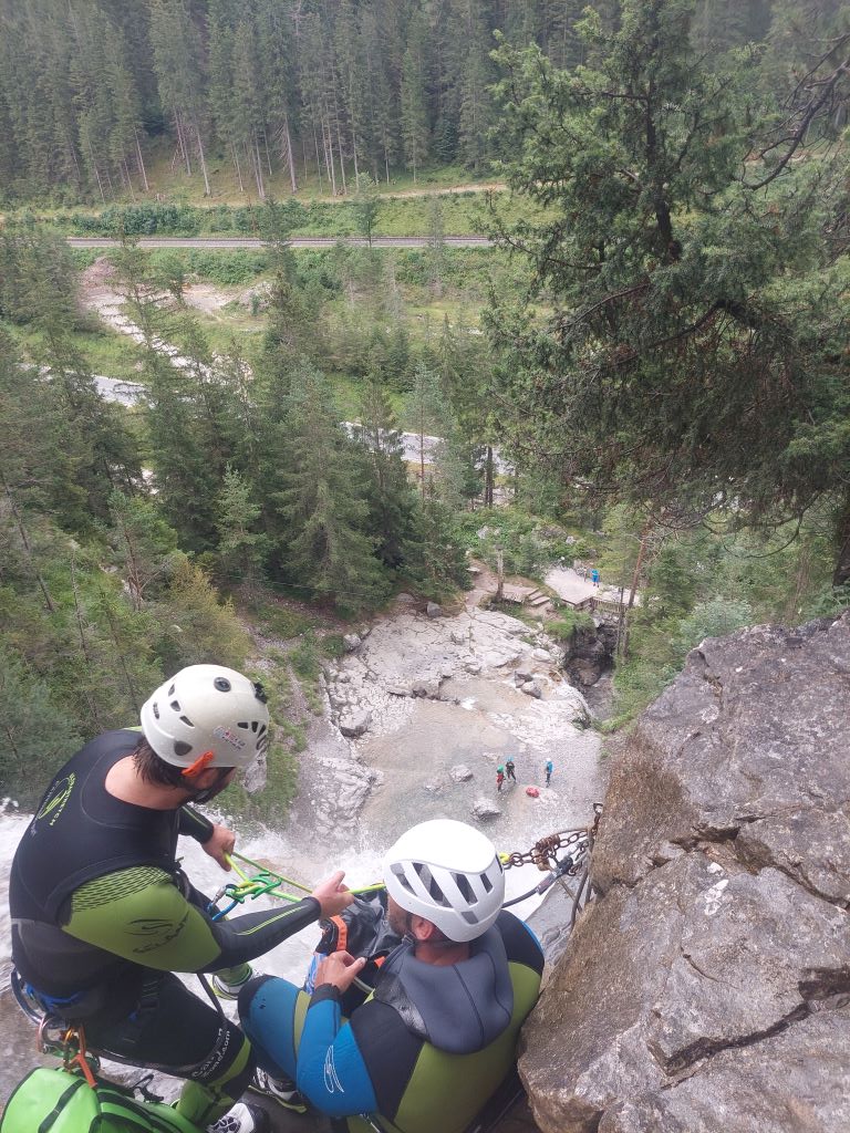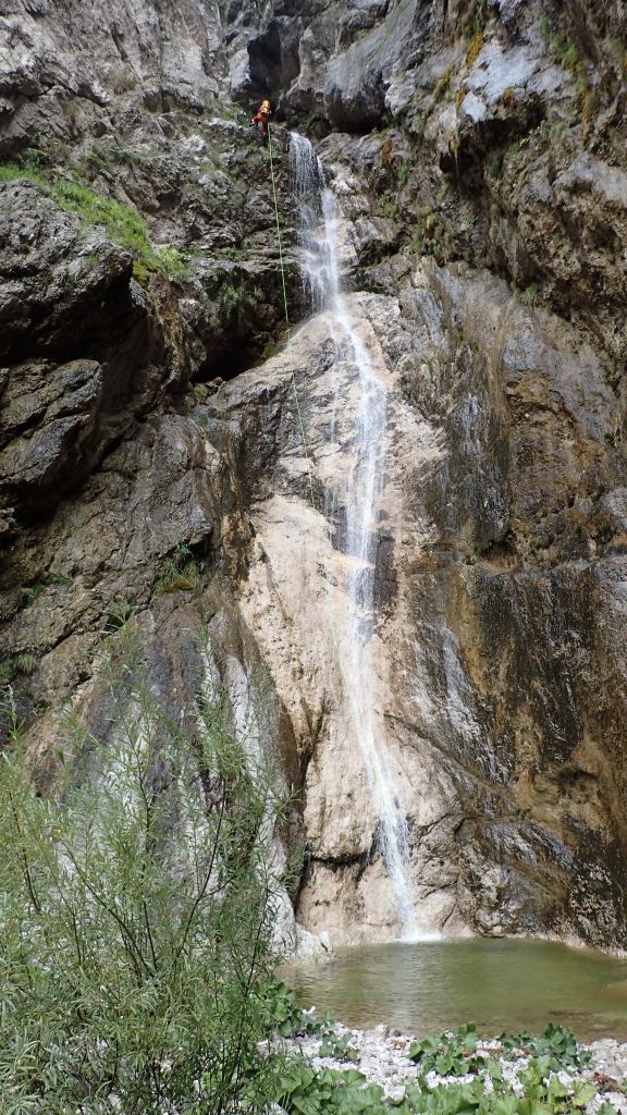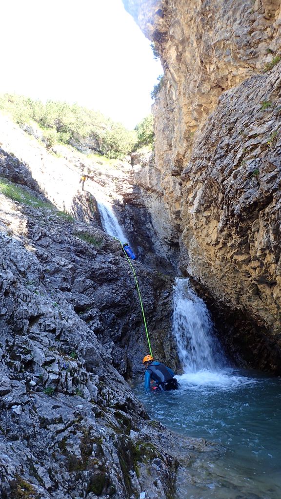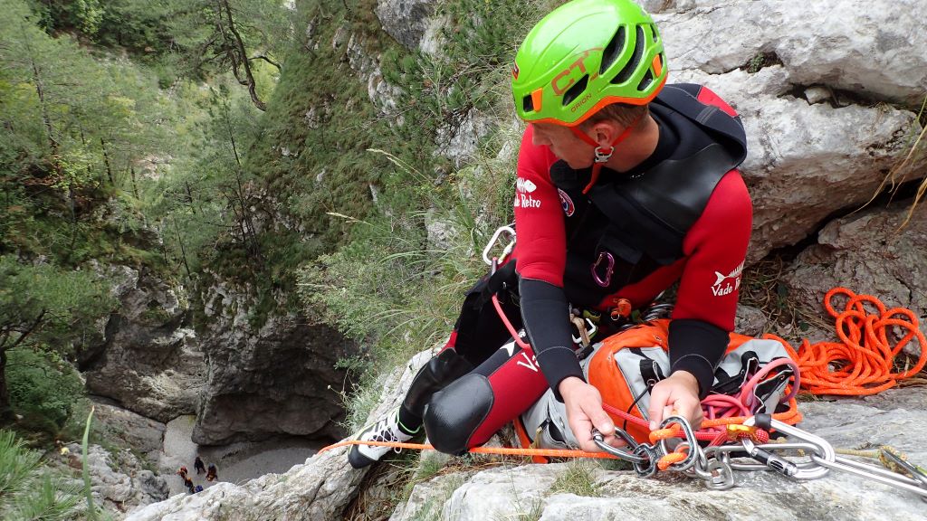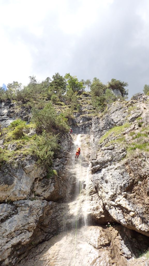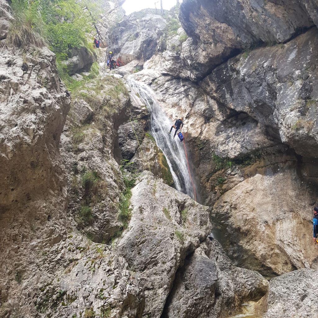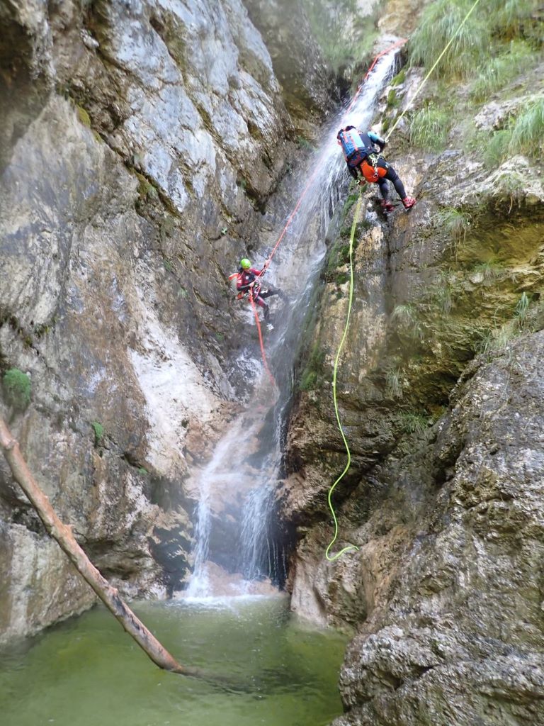 Der zweite Tag war vom Wetter und Außentemperatur richtig angenehm. Mit leicht angezuckerten Berggipfeln im Hintergrund starteten wir mit der Tour Rio Terrarossa inferiore wo wir auch zwei neue Standplätze eingebohrt haben. Am Nachmittag hatten einige von uns noch Zeit und Lust die heuer erstbegangene, kurze und schöne Schlucht „Rio Ponte de Muro“ zu machen (siehe ACA-Homepage). Bei der Fortbildung wurde der Fokus auf Seilgeländer-Aufbau, Standplatz-Optimierung und seilschonendes Arbeiten gelegt. Dies wurde in Zusammenarbeit von allen Teilnehmern gut umgesetzt. Danke nochmals an alle gut gelaunten und motivierten Teilnehmer für die gelungene Fortbildung/Ausflug.