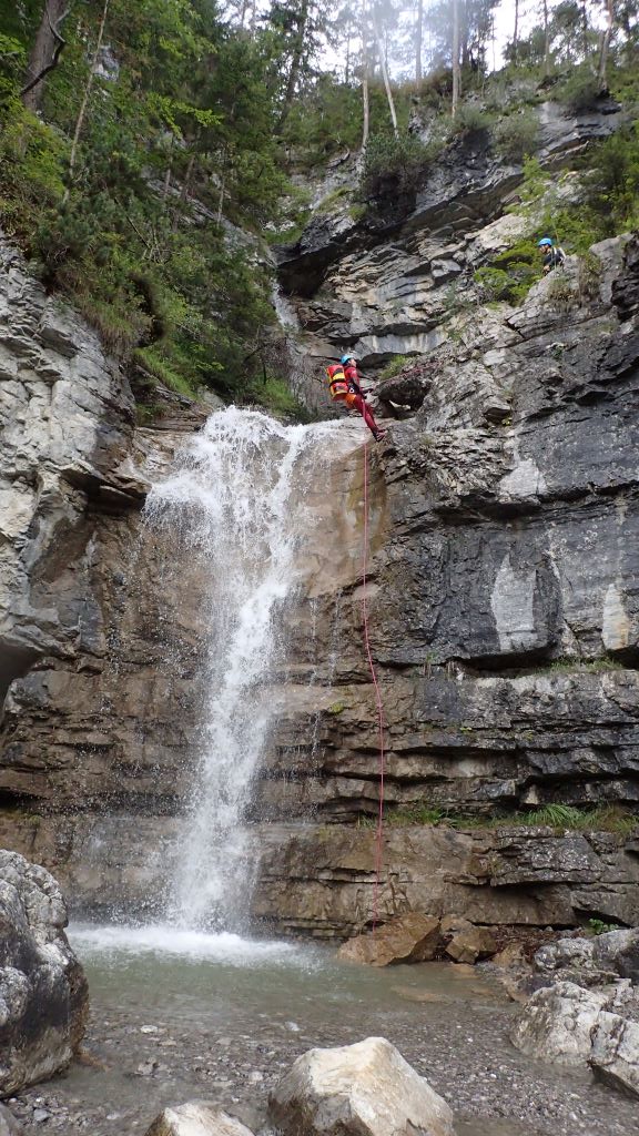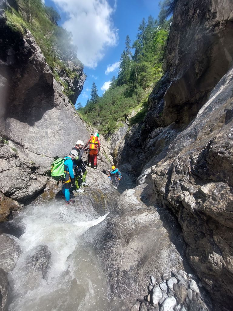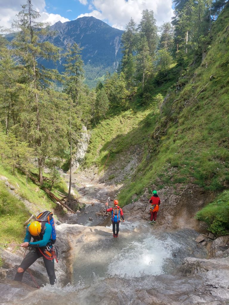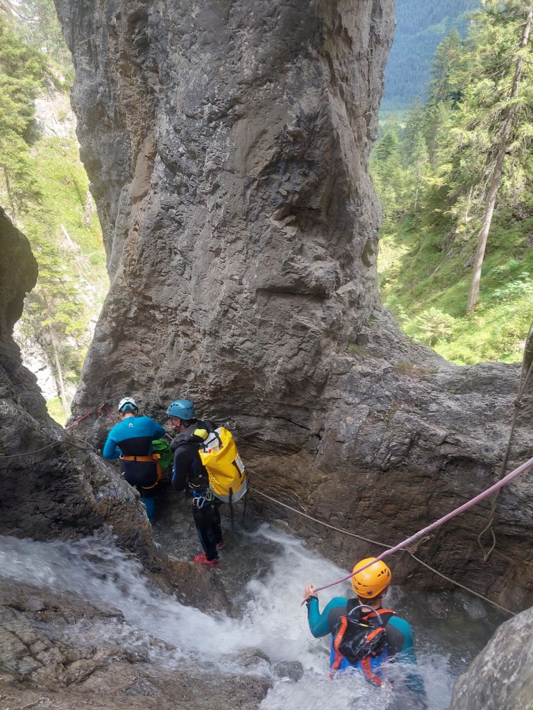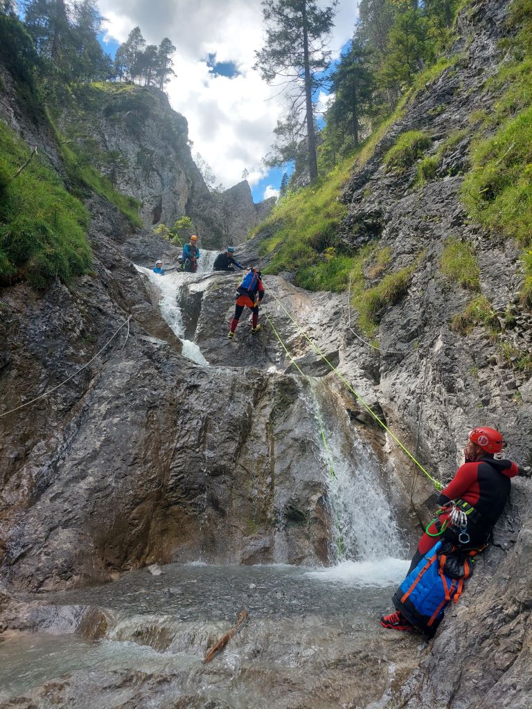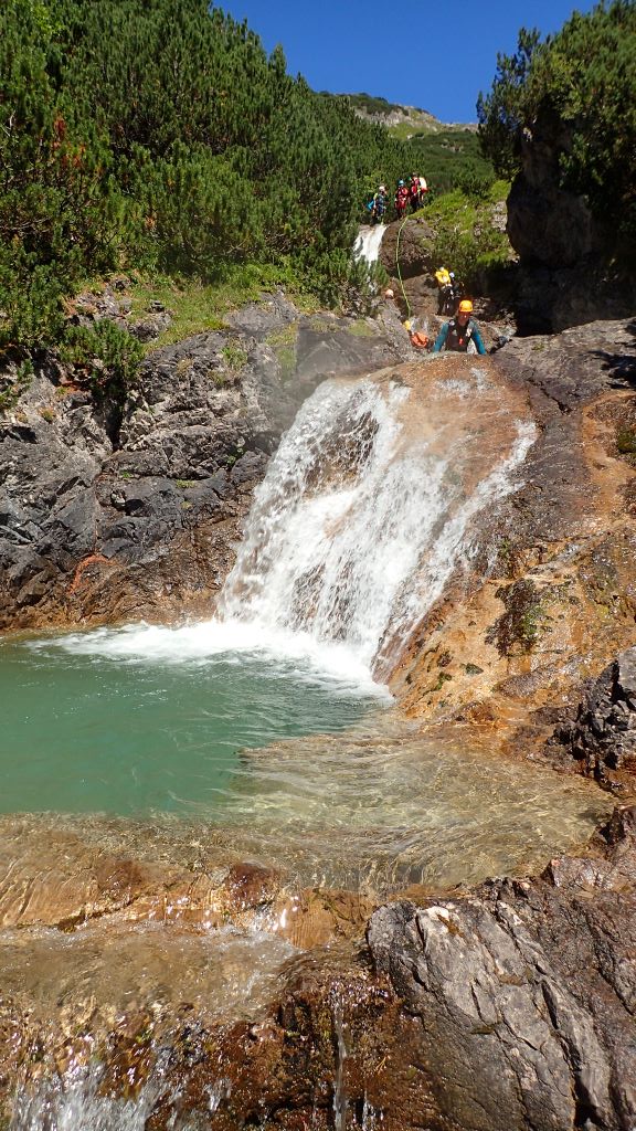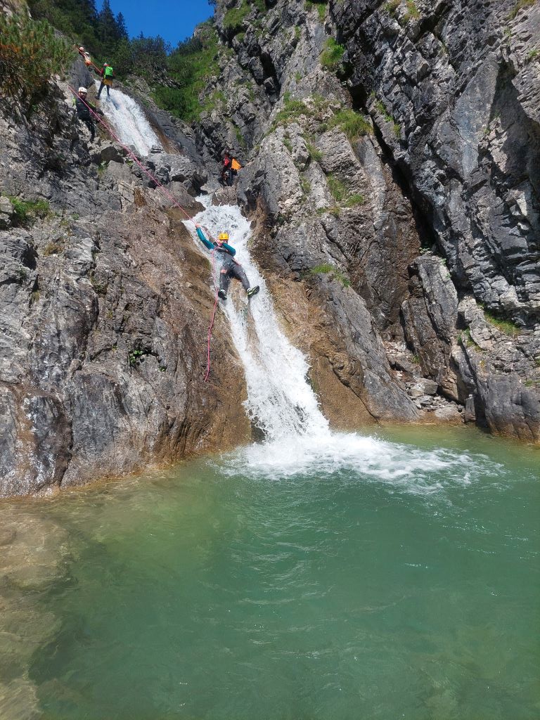 Ganz schön überrascht waren wir am 31Juli, als anstatt der sich angemeldeten 6-7 Personen, doppelt so viele Mitglieder am Treffpunkt Parkplatz Häselgehrbach eintrafen. Gottseidank hatten wir genug Seile eingepackt, so dass wir auch mit der großen Gruppe relativ schnell durch den lohnenswerten Häselgehrbach durchhüpfen konnten. Im Anschluss ging es nach Reutte wo wir neben dem Archbach zu den sehr Touristischen Stuibenfälle zurückgewandert sind. Reutte war auch gleichzeitig der Ausgangspunkt für die nahegelegenen drei Touren; Schwarzenbach, Wiesbach und Sulzlbach. Der letzte der drei genannten Bäche war der schönste und aquatischste. Nach den ersten drei Tagen ging es weiter Richtung Süden ins hintere Lechtal. Dort machten wir den Roßgumpenbach, der auch gleichzeitig das Highlight des Ausflugs war. Da die meisten von uns einen langen Heimweg hatten beschlossen wir am letzten Tag den unteren Teil vom Hochalpbach zu machen. Die Tour wäre sicher auch von weiter oben sehr lohnenswert gewesen. Auch wenn es bei den letzten Ausflügen mit dem Wetter nicht so geklappt hat, hatten wir diesmal richtig viele Sonnenstunden. Danke an die Teilnehmer insbesondere an Stephan und Michael für die gekühlten Radler nach der Tour!
