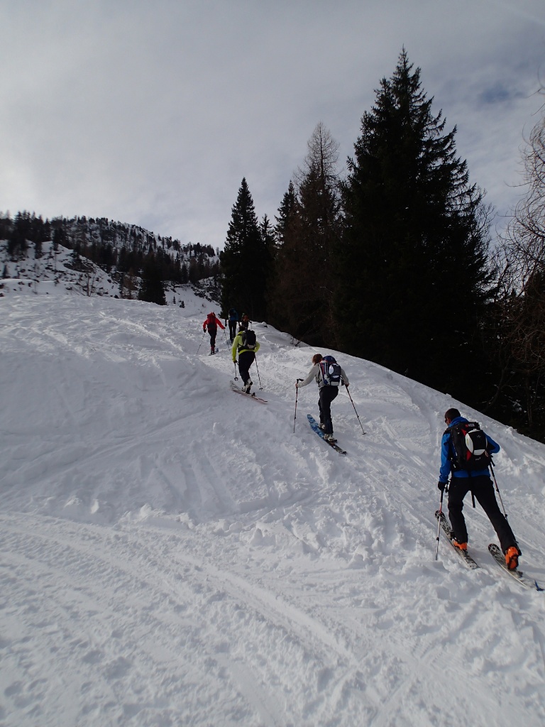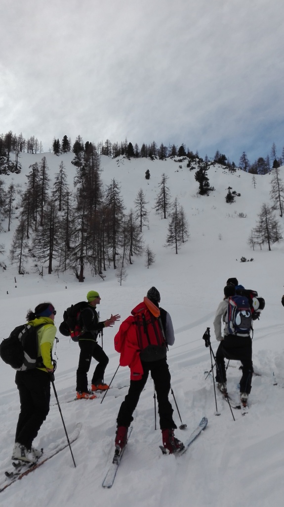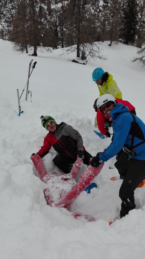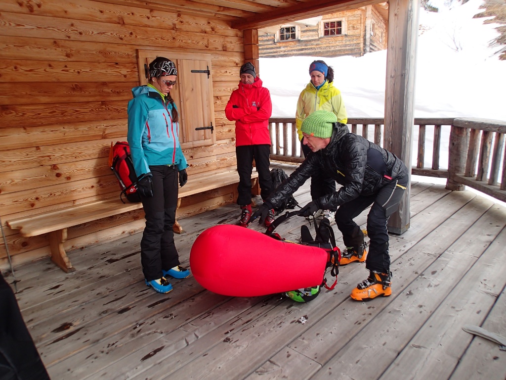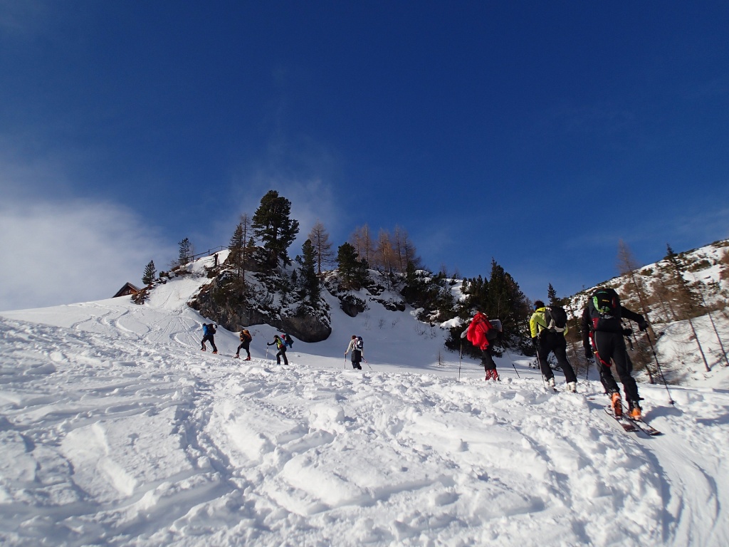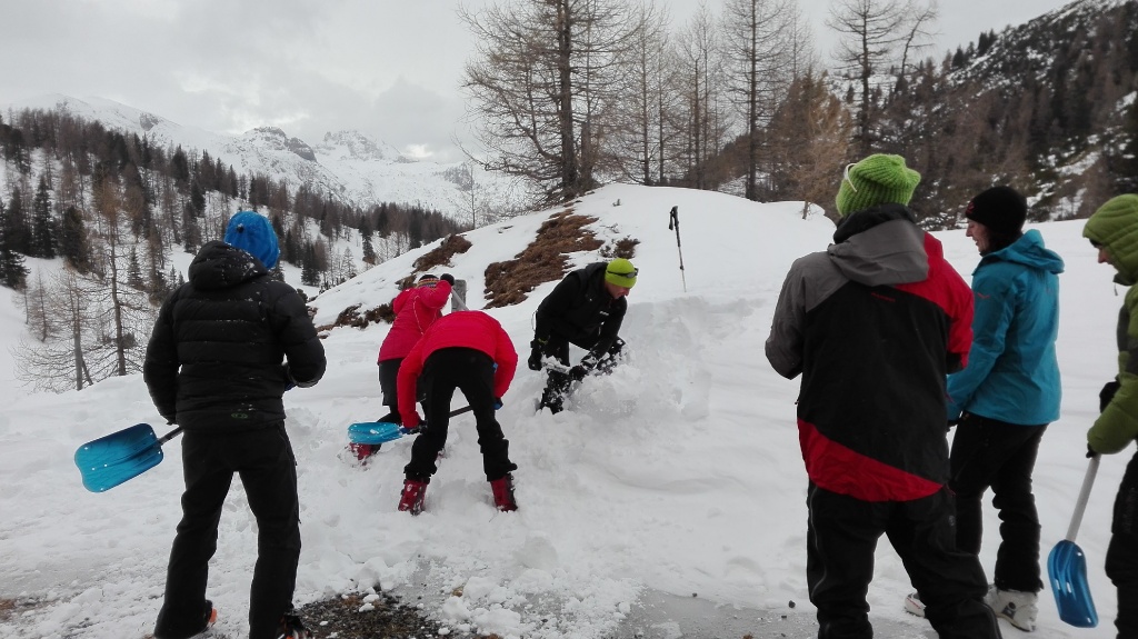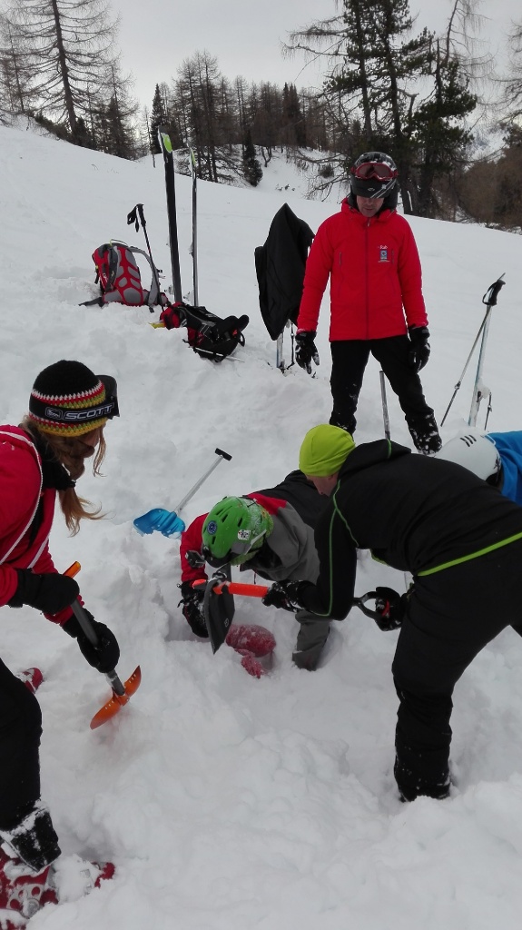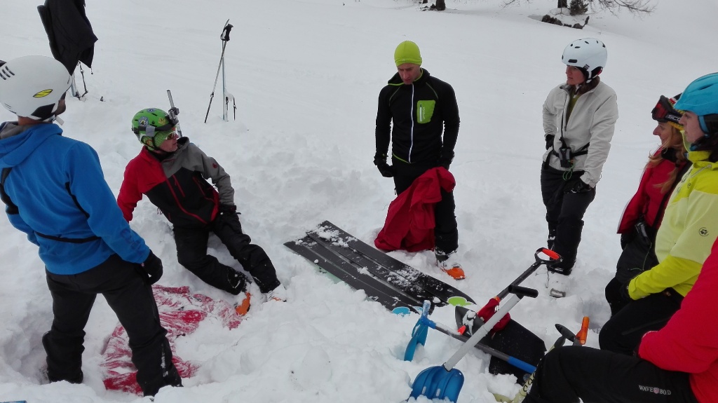 Auf der Langlaufloipe Richtung Südwienerhütte hatten wir starkem Gegenwind (Südföhn). Zu unserem Glück beruhigte sich der Wind beim Aufstieg und die Sonne schenkte uns auch noch ein paar wärmende Strahlen. Nahe der Sudwienerhütte trafen wir nach ca. 1h15min auf unser Übungsgelände wo wir folgende Übungen in Theorie und Praxis umsetzten: