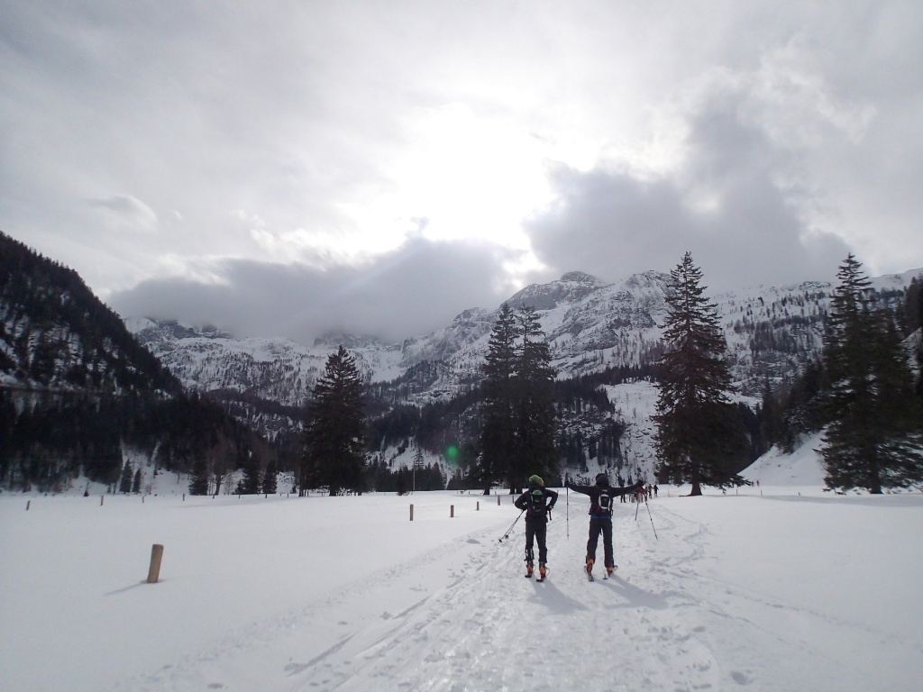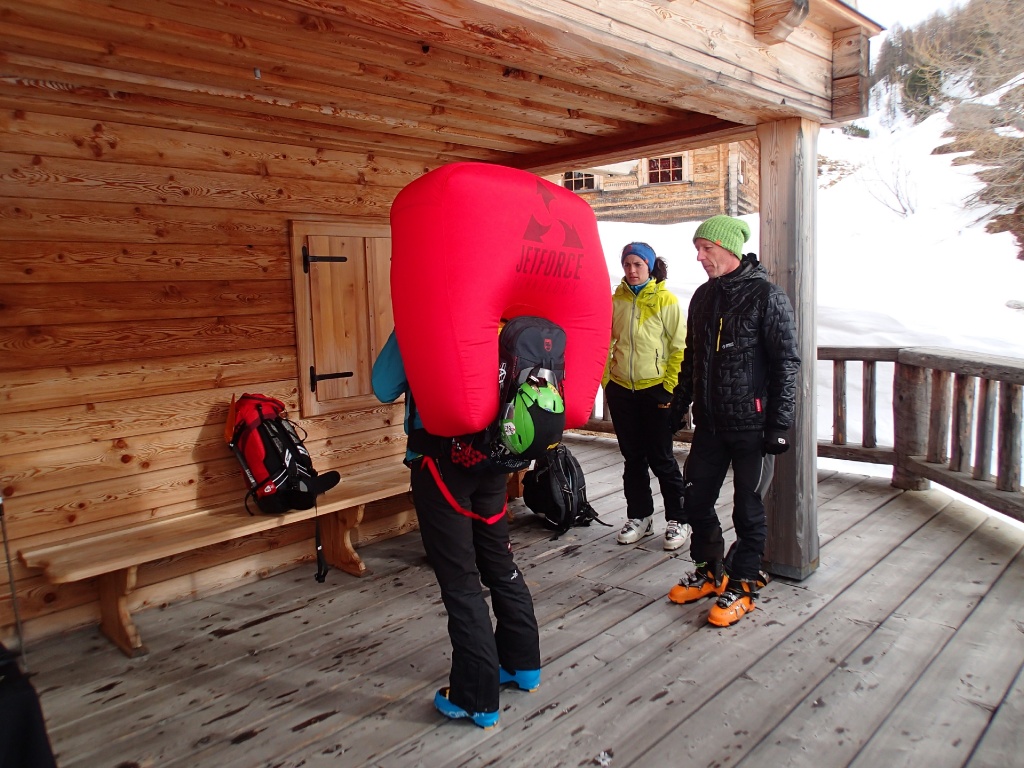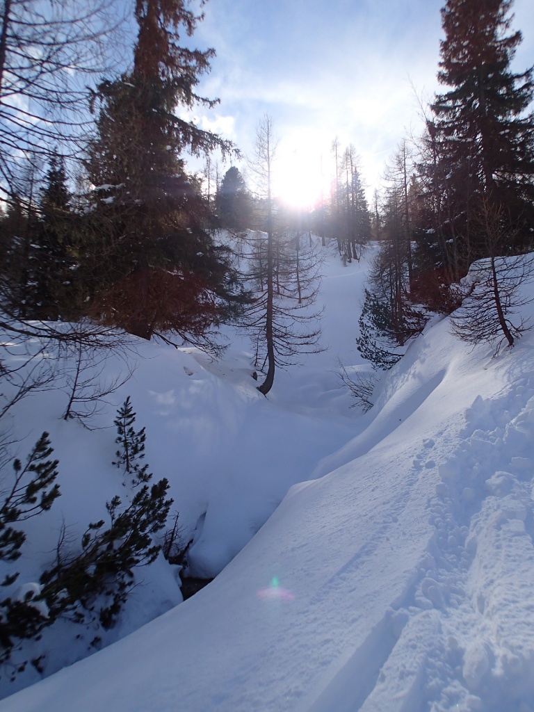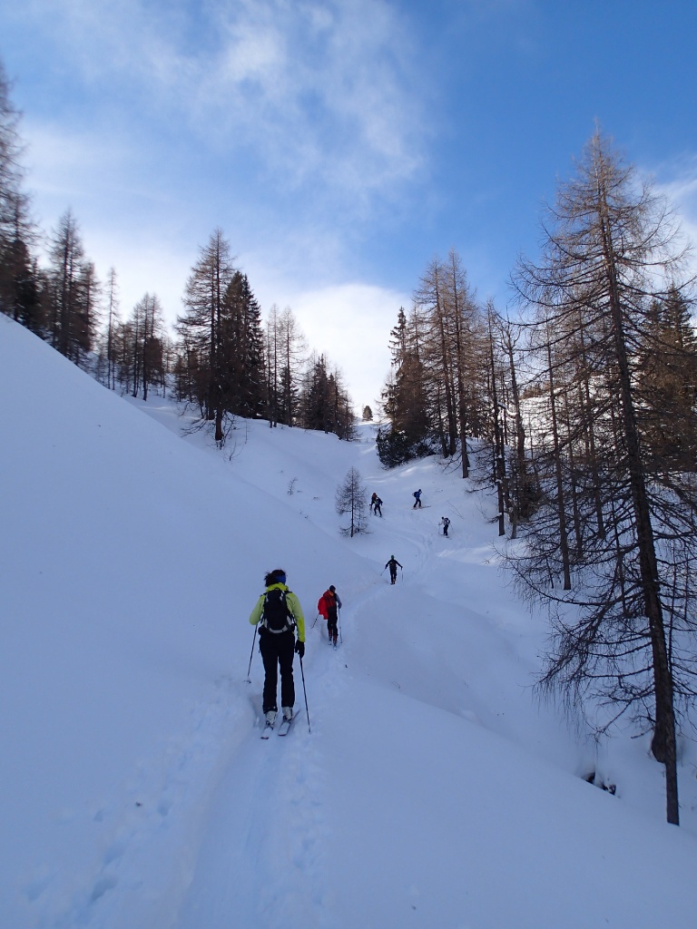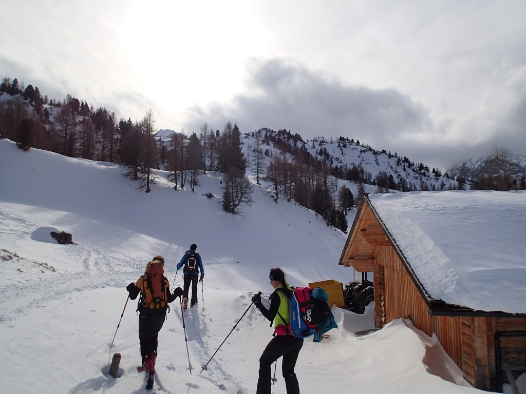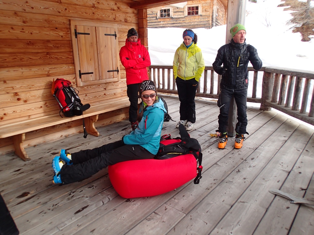 Auf der Langlaufloipe Richtung Südwienerhütte hatten wir starkem Gegenwind (Südföhn). Zu unserem Glück beruhigte sich der Wind beim Aufstieg und die Sonne schenkte uns auch noch ein paar wärmende Strahlen. Nahe der Sudwienerhütte trafen wir nach ca. 1h15min auf unser Übungsgelände wo wir folgende Übungen in Theorie und Praxis umsetzten: