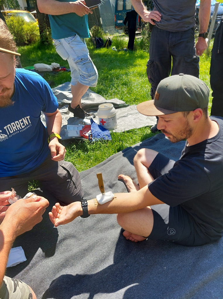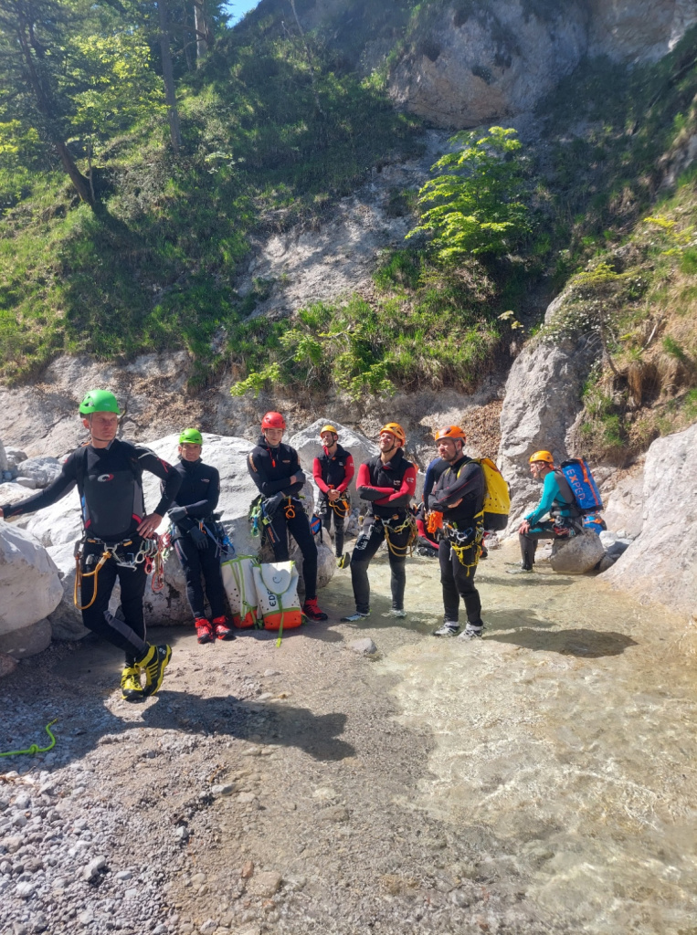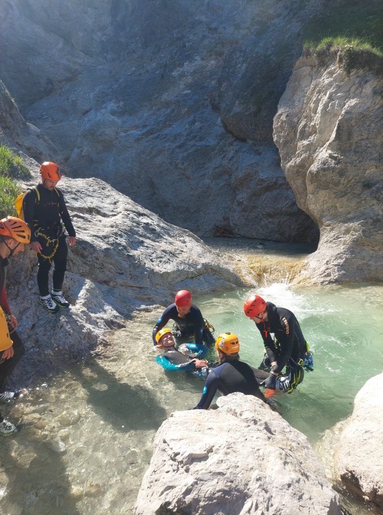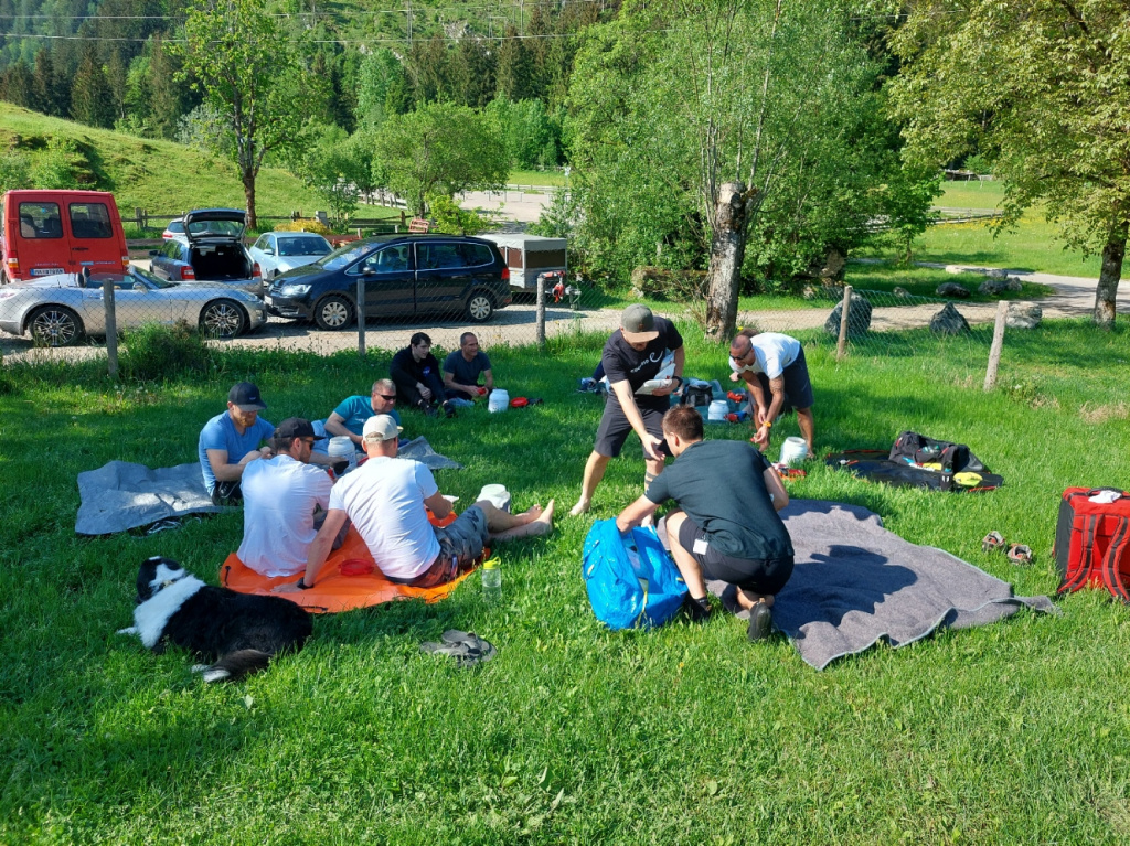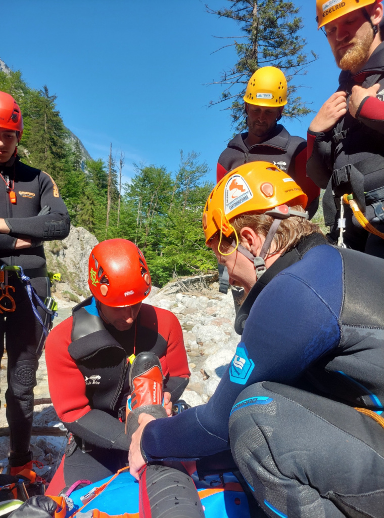 Insgesamt 13 Teilnehmer/innen nahmen beim Training am 15. Mai teil. Die Erste Hilfe wurde von Canyoning Guide und Sani Ausbilder Harald M. mit Unterstützung von Ulli, wie gewohnt sehr professionell erklärt und gezeigt. Bei schönstem Wetter konnten wir am Samstag Vormittag im Outdoorcamp (TOE) Golling und am Nachmittag in der nahegelegenen Schlucht (Fischbach) folgende Themen in der Praxis üben: